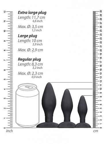 Dette buttplug settet inneholder tre buttplugger i tre forskjellige størrelser.