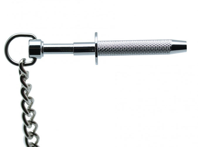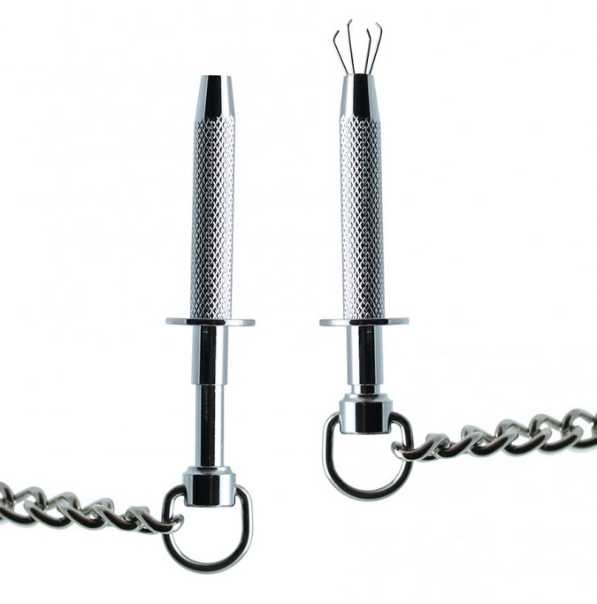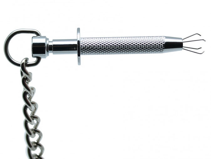 Brystklyper i metall med skarpe klyper, som kommer ut når du trykker inn stemplene.