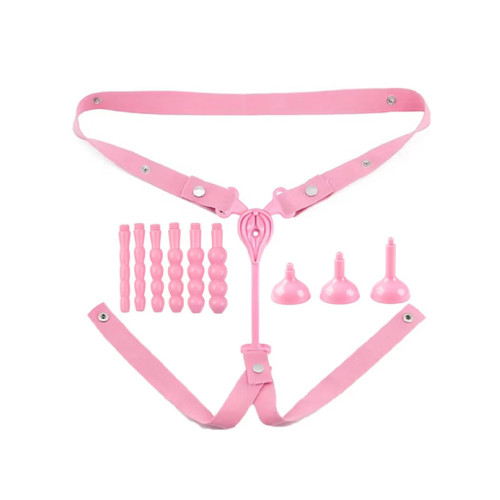 Chastity Penis Plugg Belte er et rosa og tøyelig kyskhetsbelte designet for deg som ønsker en visuell transformasjon kombinert med funksjonell kontroll. Beltet har en bøyle i front med et vulvalignende design og et sentralt hull hvor du kan feste en av de medfølgende pluggene eller hettene.
