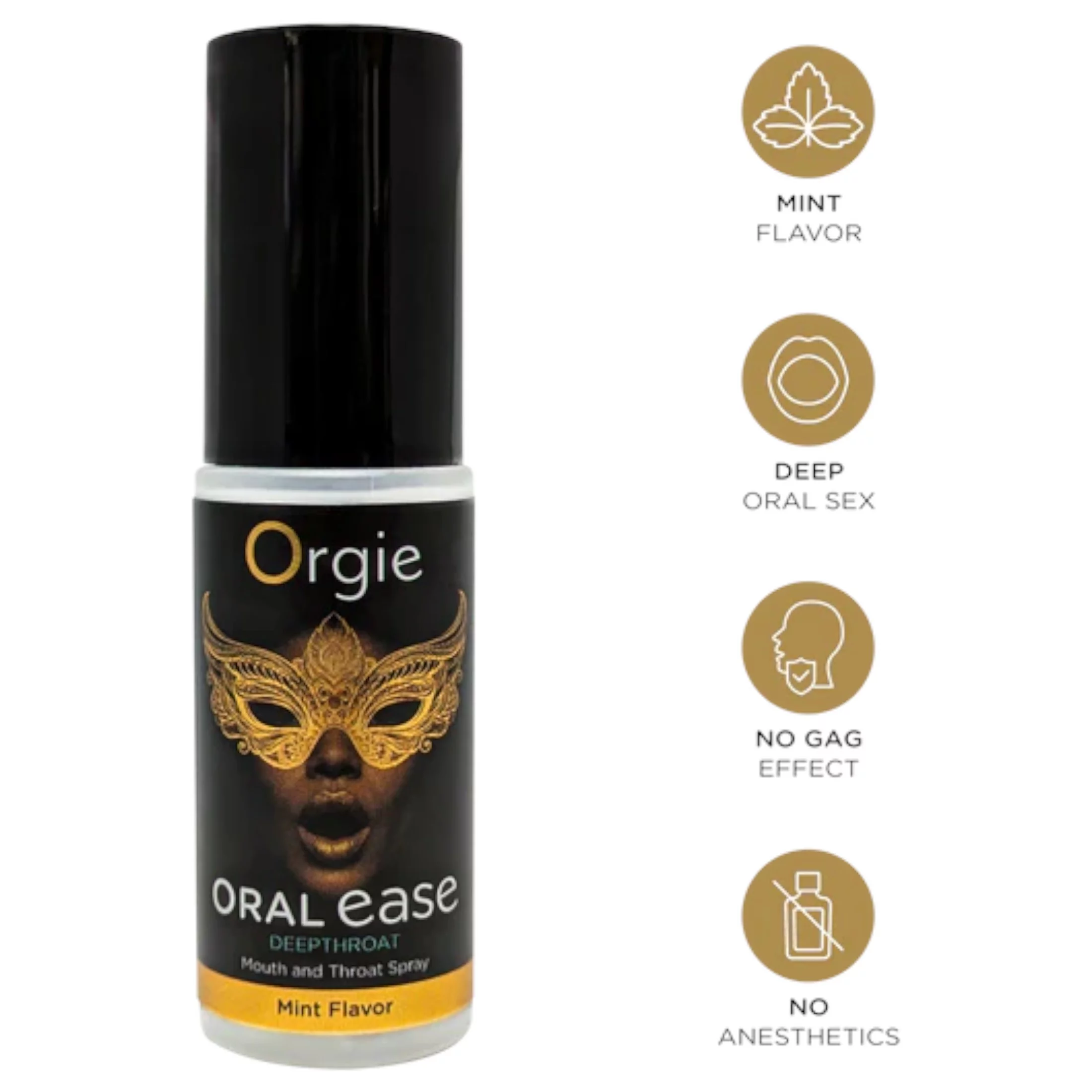 Vil du gå dypere uten brekninger og bekymringer? Orgie Oral Ease er en frisk munnspray som er utviklet for å gjøre oralsex, og spesielt deepthroat, mer komfortabelt og lystbetont. Den reduserer følsomhet akkurat nok til at du kan slappe av og fokusere på nytelsen, helt uten bedøvende midler.