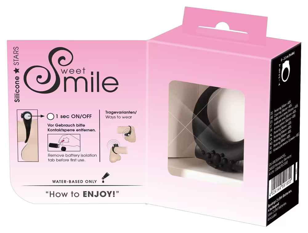 Når du vil ha litt ekstra futt i sakene og et smil som varer lenge. Sweet Smile Penisring kombinerer deilig stramhet med vibrerende nytelse som stimulerer både deg og partneren. Den myke, fleksible ringen sitter behagelig rundt skaftet og gir en fastere ereksjon, mens den lille avtakbare bullet-vibratoren gir deilige pulser rett der det trengs mest.