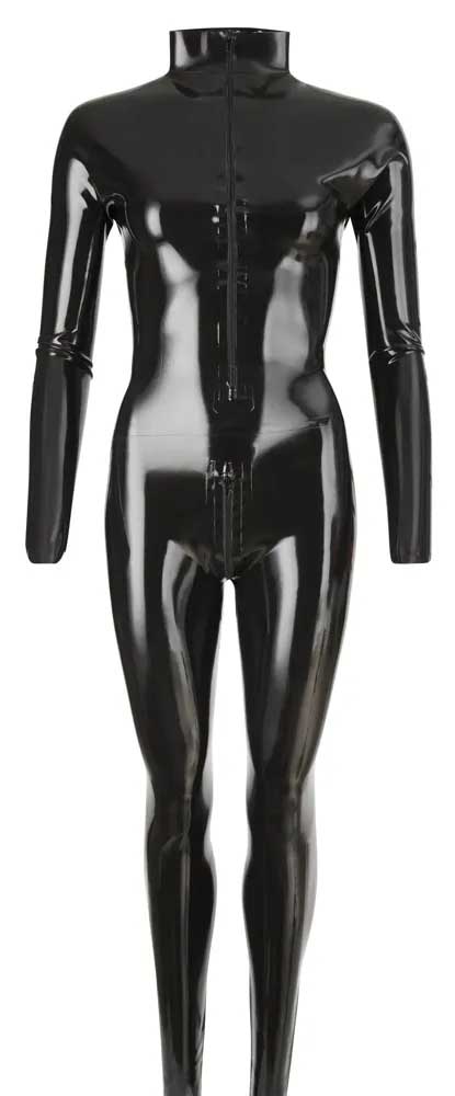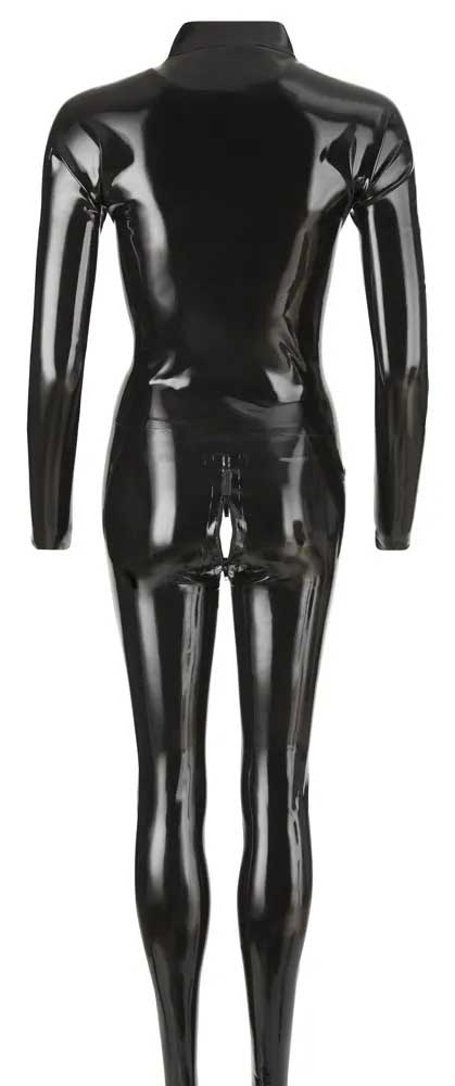 Catsuiten har en stå krage og en 50 cm lang glidelås i front.