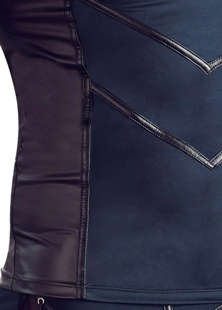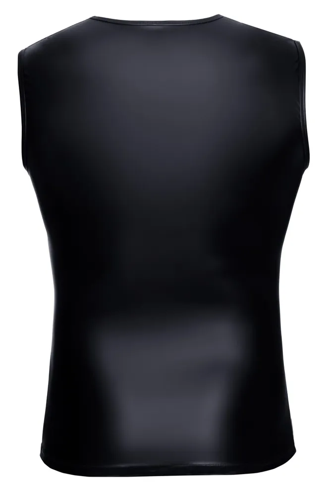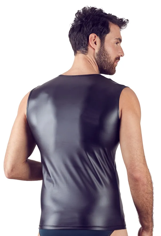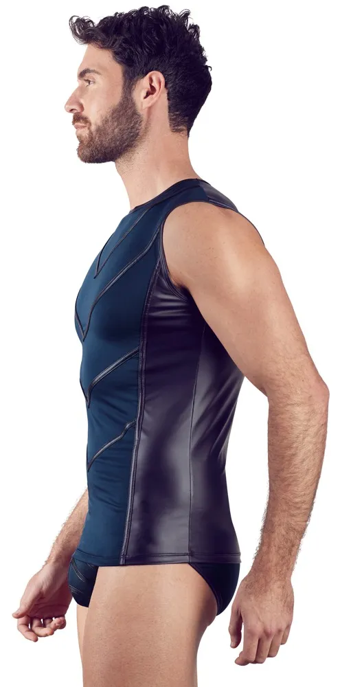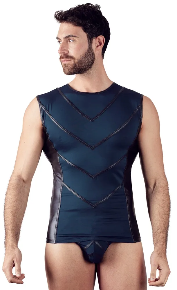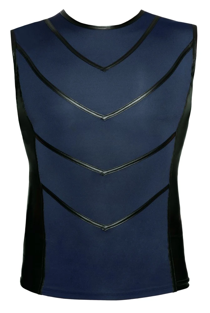 Skjorten har svarte V-striper foran som betoner musklene, og et maskulint mattlook materiale på baksiden som fremhever ryggmusklene.