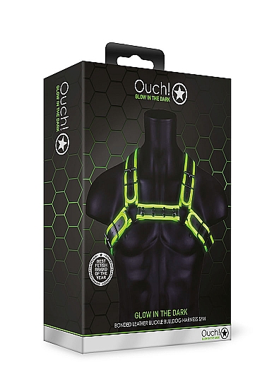Glow in the dark Bulldog harness med tykke, sorte stropper som gir deg et maskulint og dominant utrykk med grønne, fluorescerende kanter.
