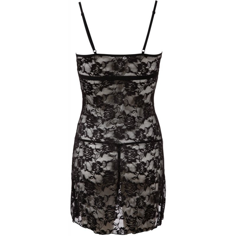 Neglisjén er deskorert med sorte blomsterblonder og et pent pyntebånd under brystene.