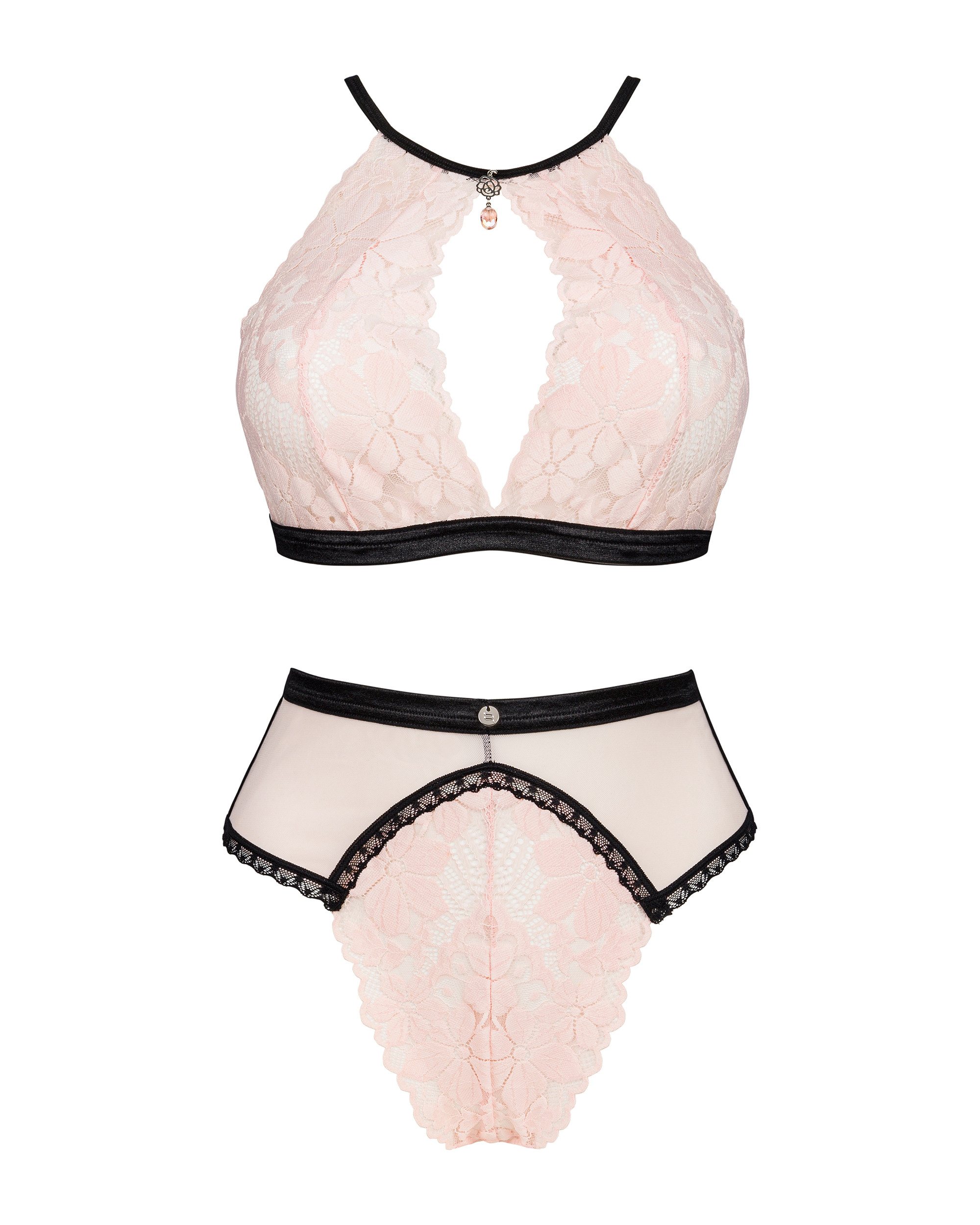 Settet består av en overdel med høyhals, lyserosa blonder og sorte stropper.