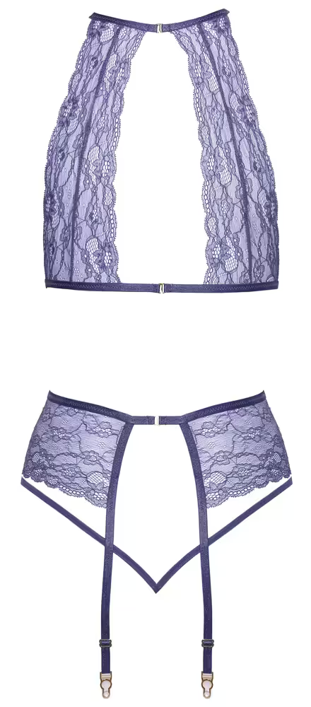 Inkluderer en overdel, hofteholder og matchende string i nydelige, lavendel blonder.