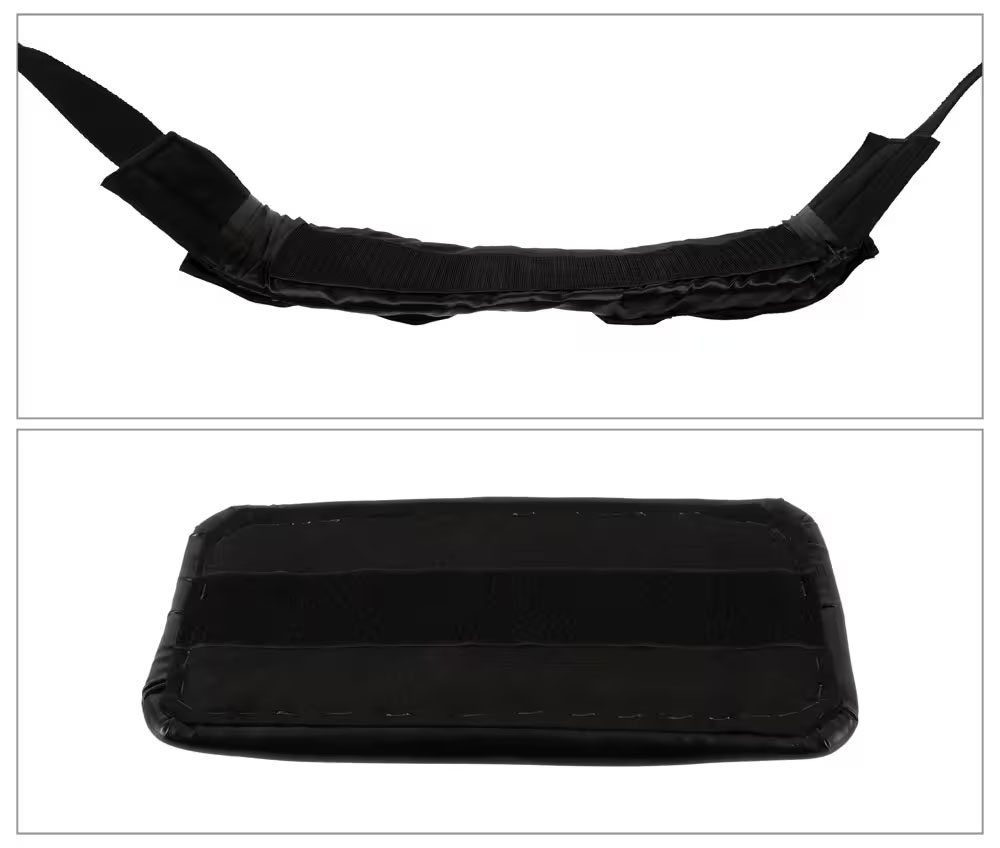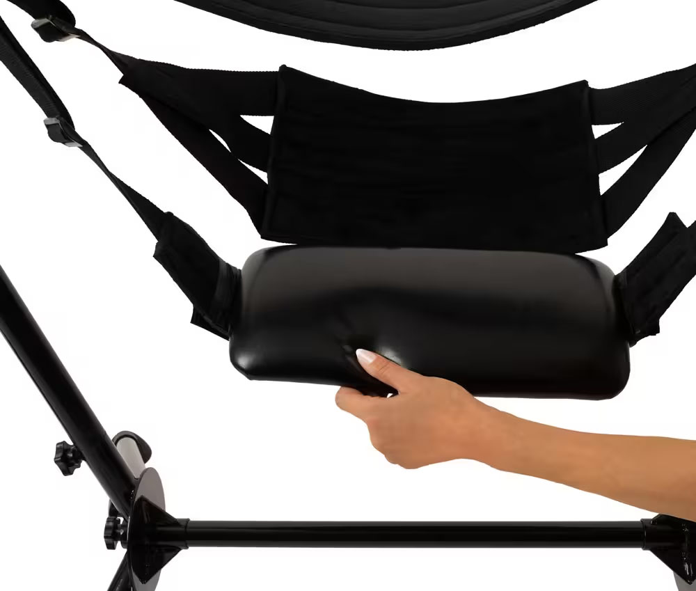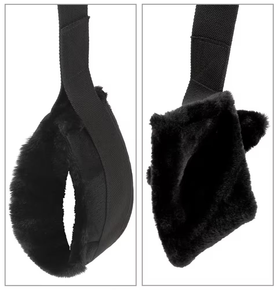 Husken har tre myke sete- og hvileputer, to fløyelsmyke løkker for støtte og justerbare, sikre stropper som gir en behagelig og trygg opplevelse. Seteputen har et borrelåsfeste og kan enkelt fjernes.