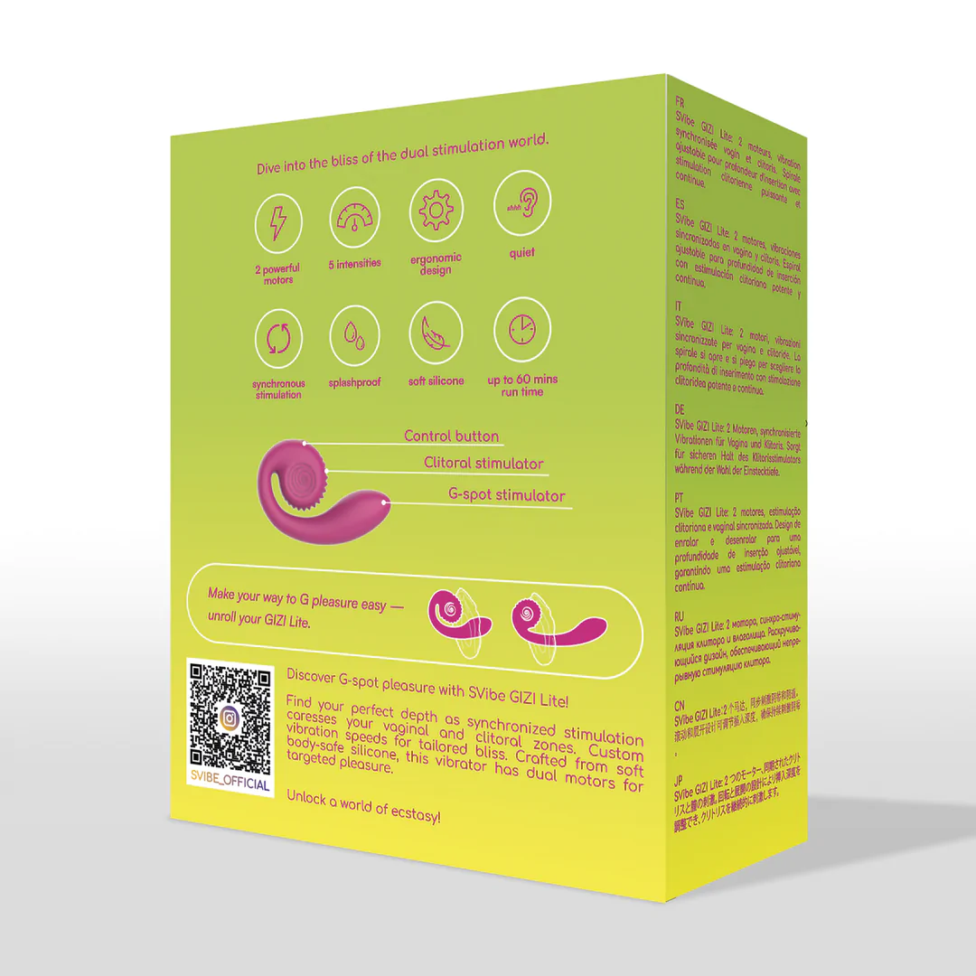 Gizi er en liten revolusjon i seg selv. Den ser kanskje ikke ut som en klassisk rabbitvibrator, men du kan være trygg på at den gjør jobben og litt til. Med sin unike Snailvibe-design følger den kroppens naturlige kurver og gir dobbel stimulering uten at du trenger å justere eller holde igjen. Den rullende klitorisdelen beveger seg i takt med kroppen din og holder konstant kontakt, slik at du får rytme og flyt som føles helt naturlig.