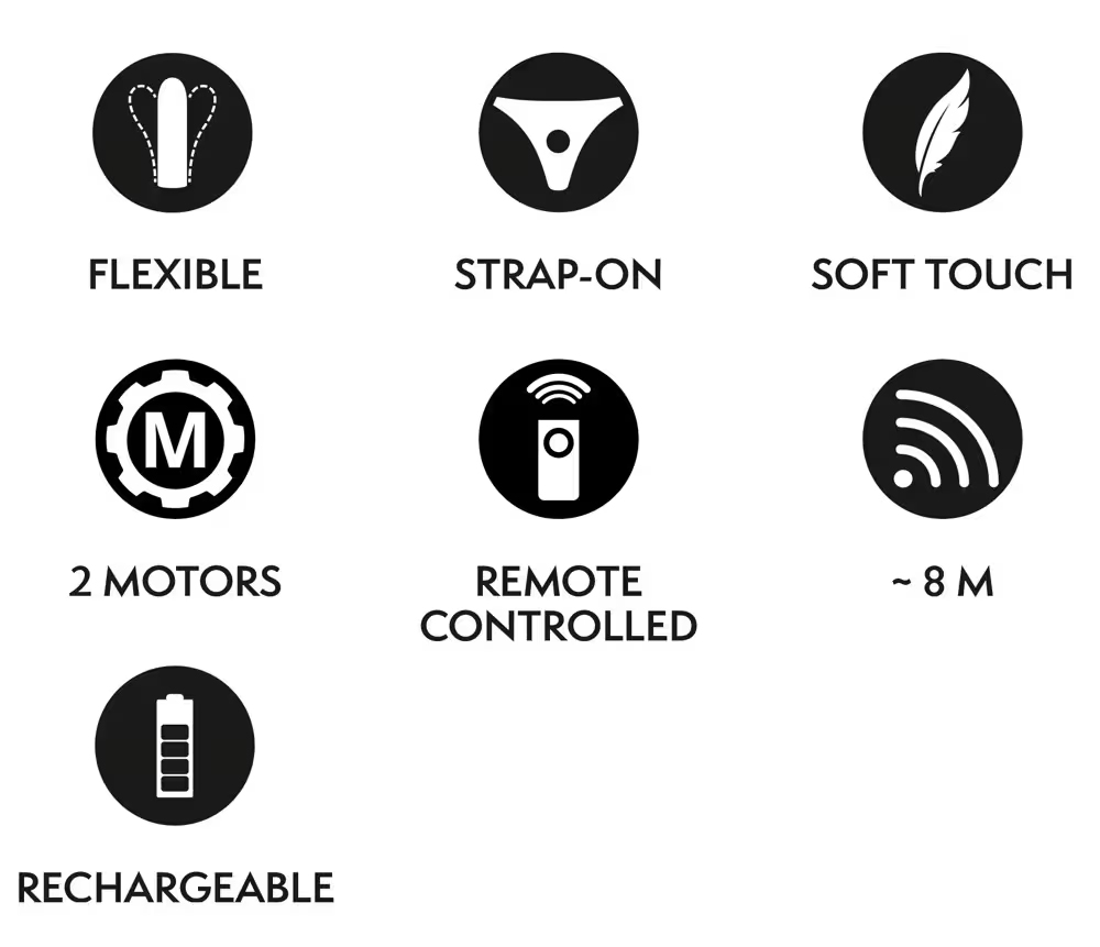 Settet inneholder en justerbar strap-on sele, en anatomisk formet vibrator med 2 motorer for å gi vibrasjon til begge, og en fjernkontroll for å enklere styre programmene uten å måtte stoppe opp å lete etter knappen.